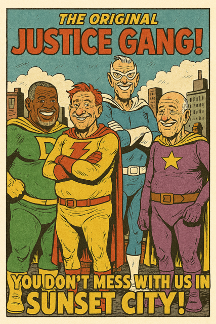These seasoned saviors patrol the shuffleboard courts and cafeteria lines of Sunset City, a retirement community with more secrets than the NSA and more drama than cable news. You may not find them in the latest DC Studios movie, but don’t tell them that. They’re fairly certain they came up with the name “Justice Gang” first—back in the late ’60s, give or take a decade.